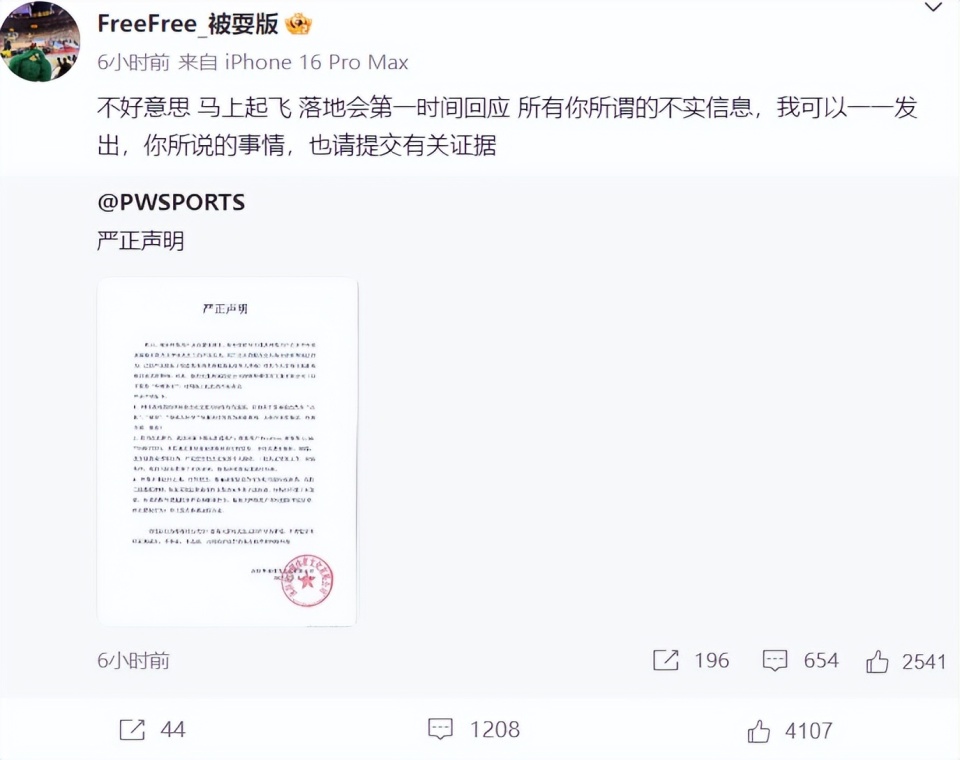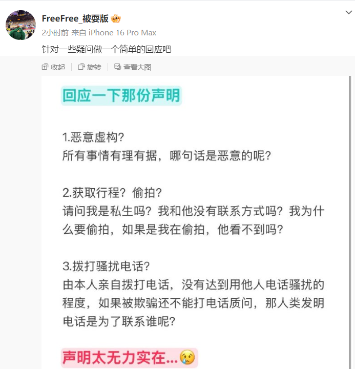 FreeFree_被耍版转发了徐杰方的声明后写道:你所谓的不实信息,我可以一一发出,你所说的事情也请提交有关证据。