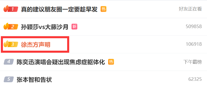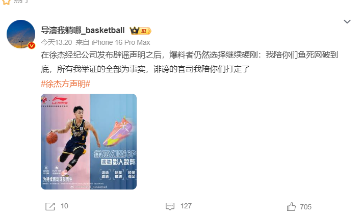 徐杰本人也转发了这份声明,随后徐杰方的声明登上了热搜榜,一度是冲到热搜第一的位置。徐杰本人也关闭了社媒的评论、搜索功能,希望能平息一下舆论,但爆料者却选择了硬刚。