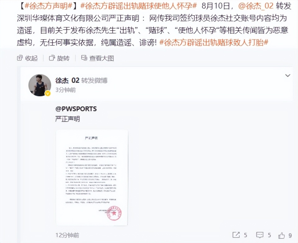 因为事态发展的过快,徐杰所在的经纪公司-深圳华璨体育文化有限公司发布严正声明——网传我司签约球员徐杰社交账号内容均为造谣,目前关于发布徐杰先生“出轨”、“赌球”、“使他人怀孕“等相关传闻皆为恶意虚构,无任何事实依据,纯属造谣、诽谤!