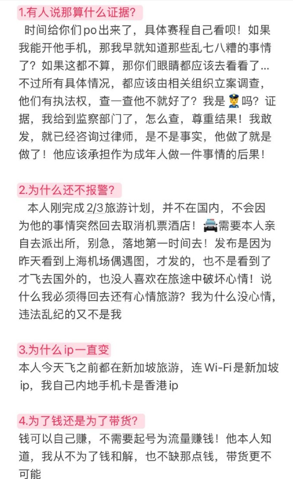随后她还在社媒上回应了网络上质疑她的7个疑点: