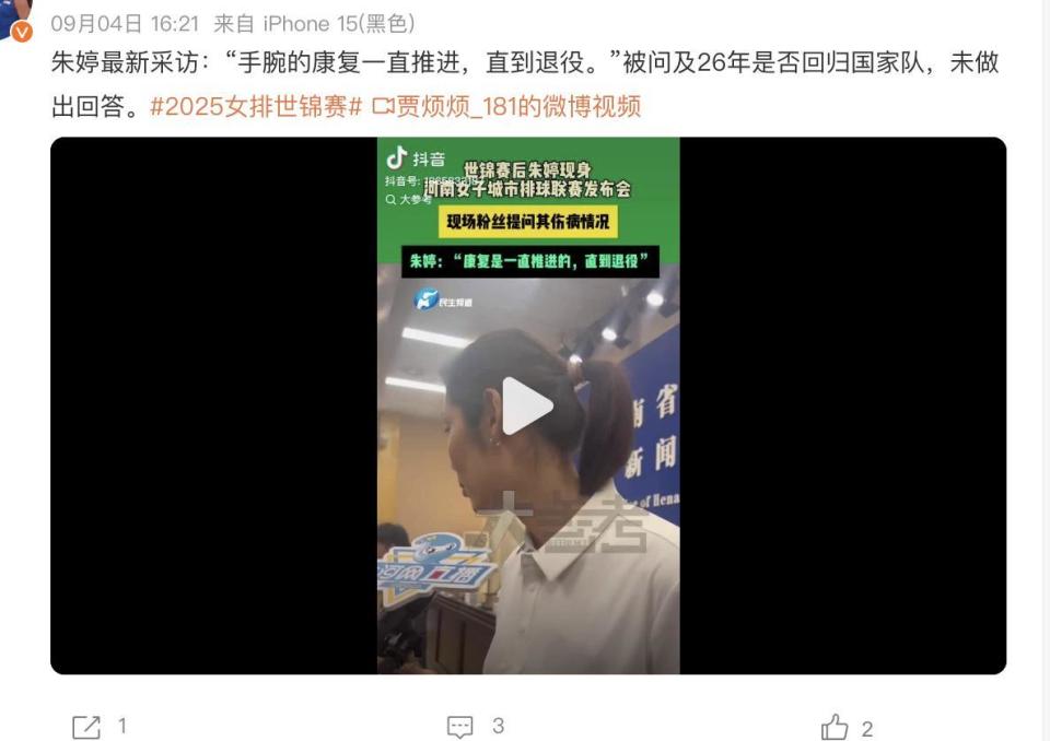 活动期间,当地媒体对朱婷进行了专访,重点询问了外界普遍关心的两个问题。首先是关于她的手腕伤势恢复情况。从现场照片可见,朱婷手腕仍佩戴着保护装置,这自然引发了对其伤情的担忧。对此,朱婷回应称,手腕伤势正处于持续康复过程中,但这类伤病往往需要在整个职业生涯中进行长期管理。她坦言完全康复的可能性不大,关键在于日常训练和比赛中做好防护措施,避免过度使用,这样才能确保不影响后续的职业发展。